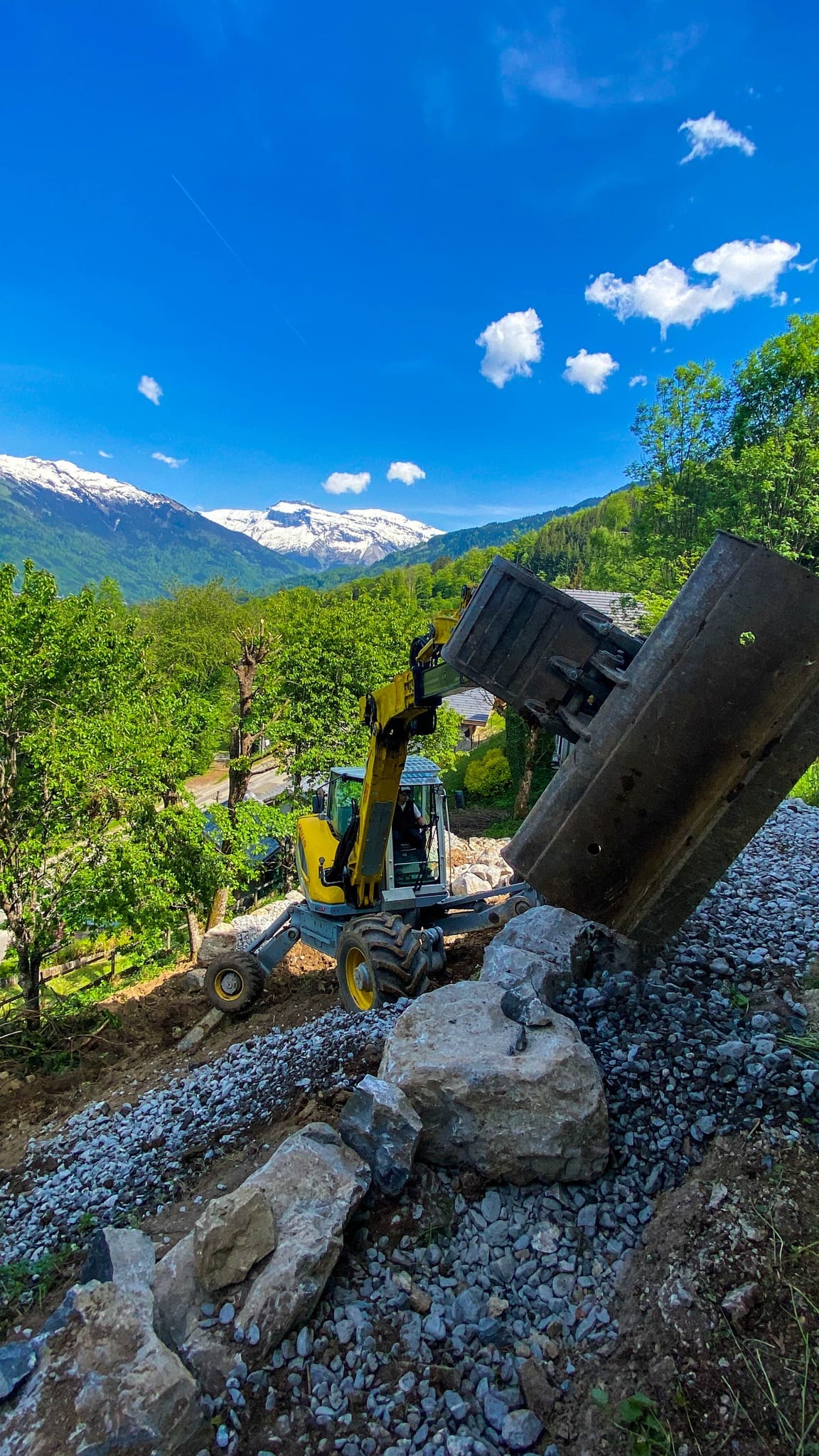 Pose de blocs rocheux pour le soutènement, la protection contre l’érosion et le modelage de terrain.
